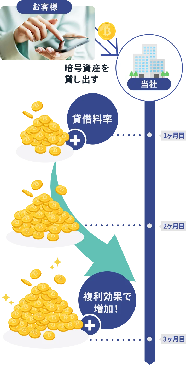 お客様が保有する暗号資産(仮想通貨)を「らくらくちょコイン」にお貸出しいただくだけで、毎月一定の利率で計算した貸借料(利息)を得ることができます。